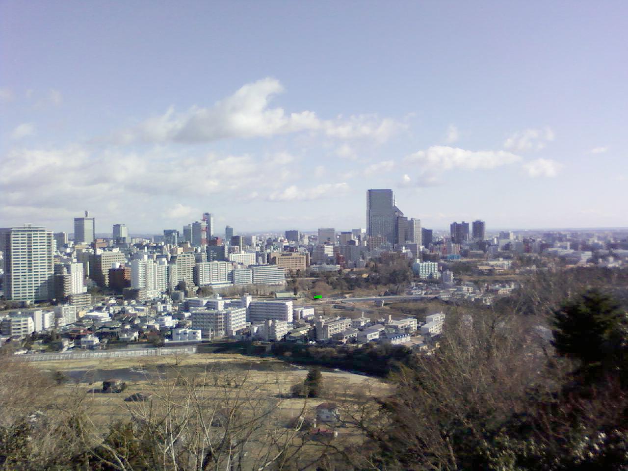 仙台観光の定番、青葉山天守台の政宗公騎馬像と護国神社です。市内を一望すると、昨年完成した仙台トラストタワーが一段高く見えます。