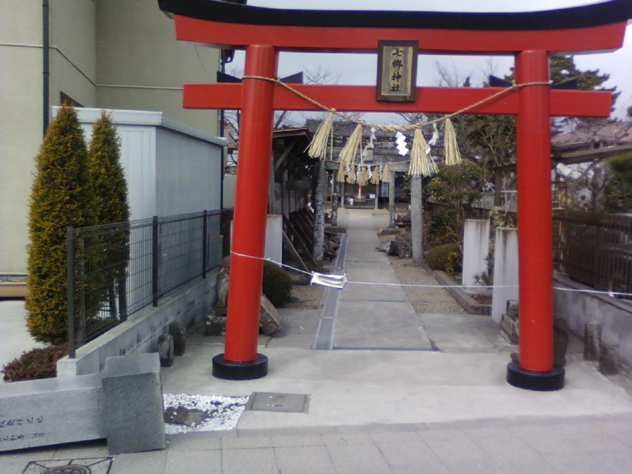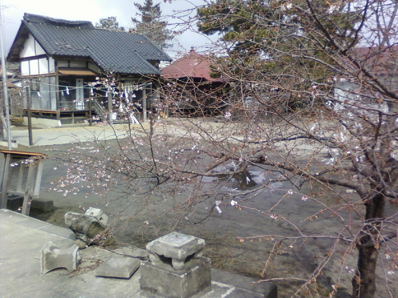 地震で屋根瓦の一部が崩れてい、鳥居脇の神社由来碑も倒れていました。