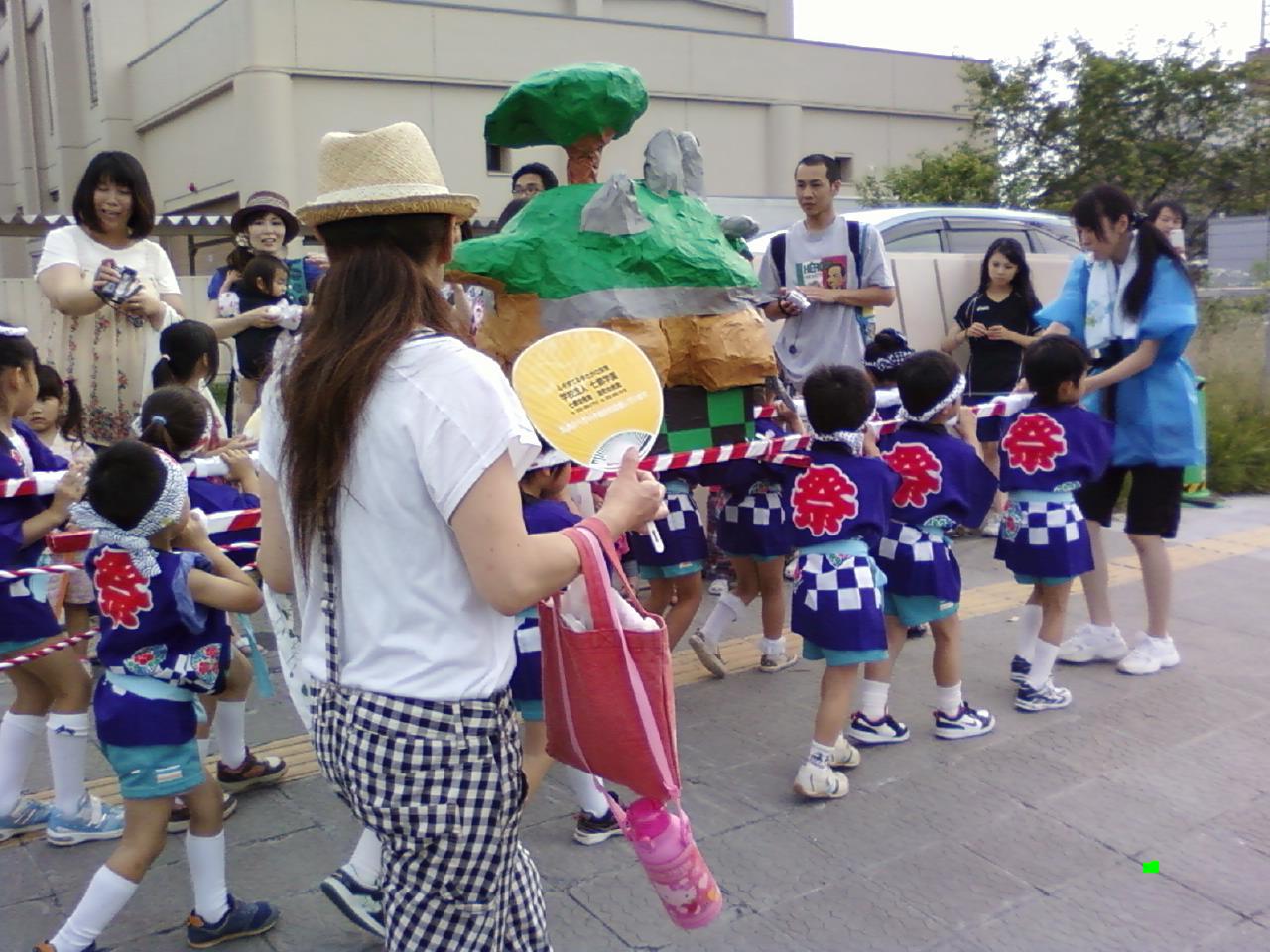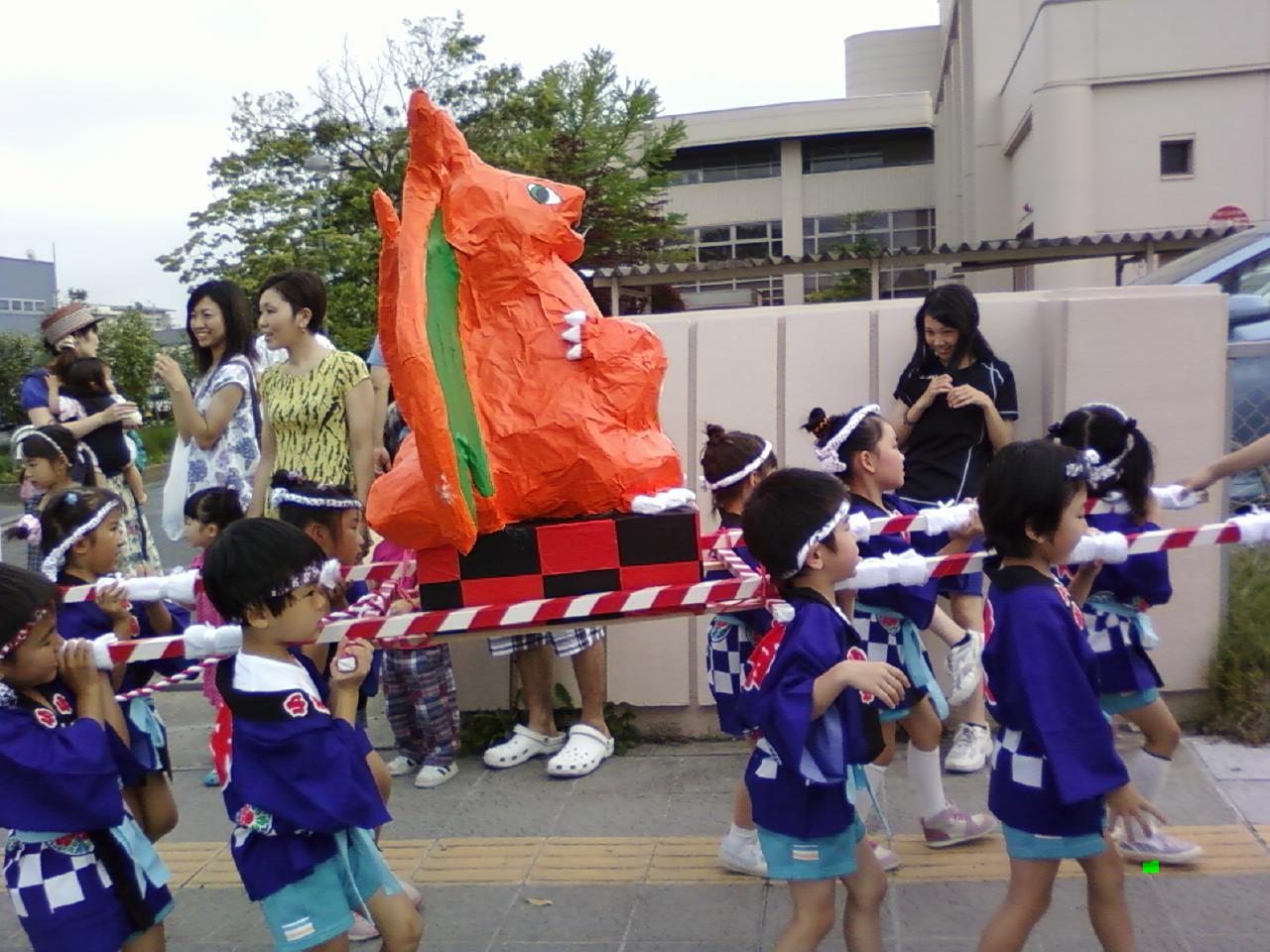 七郷市民センター前を元気に行進する子どもたち。おみこしの上はポケモンキャラクターでしょう。7月2日、七郷幼稚園の夏祭りです。