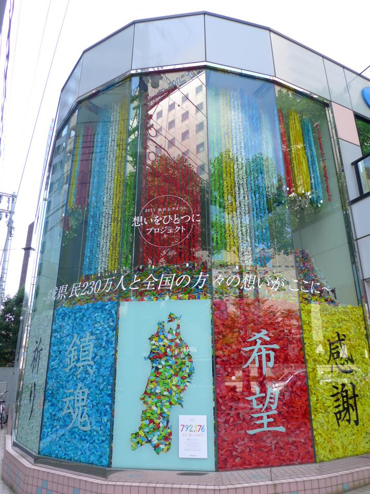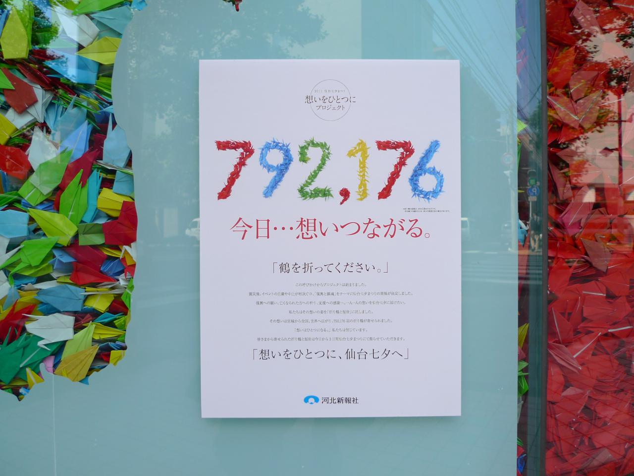 「想いをひとつにプロジェクト」で集まったたくさんの折り鶴が河北仙販中央支店に飾られています。