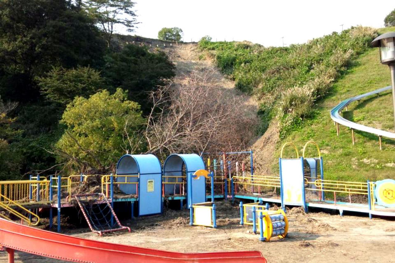 広場が地滑りで