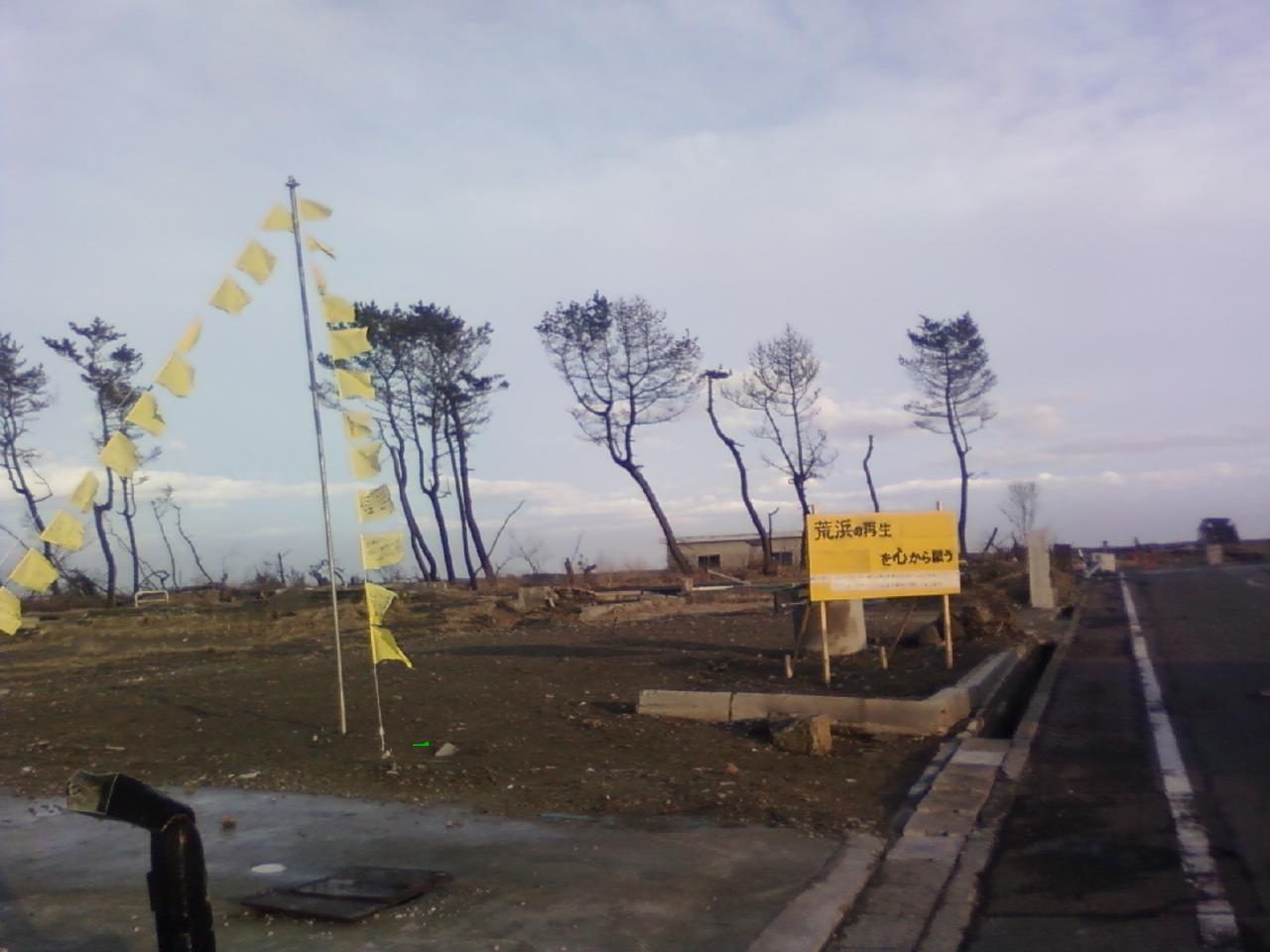 あの日からもうすぐ1年、荒浜(深沼)小前の道路端に復興を祈るように黄色いハンカチが風にはためいています