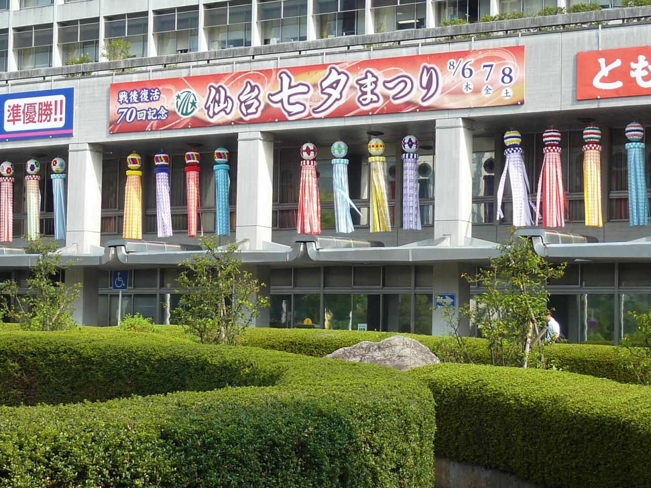 仙台市役所に飾られた吹き流しです。今年の七夕祭りは戦後復活70回記念の節目だそうです。