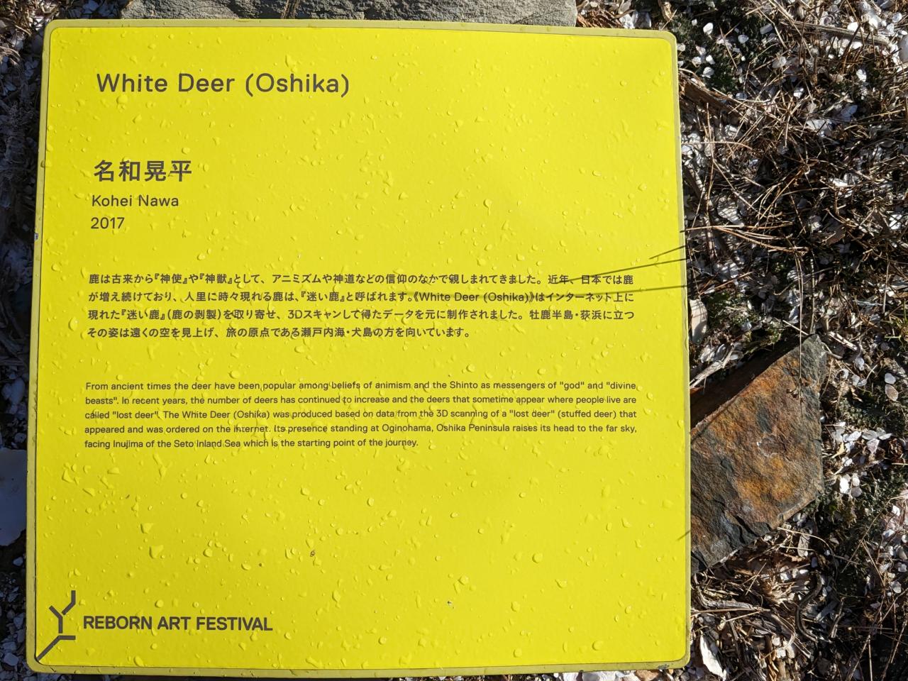 仙台からちょっと離れてすみません。石巻市牡鹿半島の萩浜にある白い鹿の彫刻です。リボーンアート・フェスティバル2017で発表されたイベントのシンボル、震災後の「復興のシンボル」的存在となっているようです。展示は2027年までの予定とのこと。