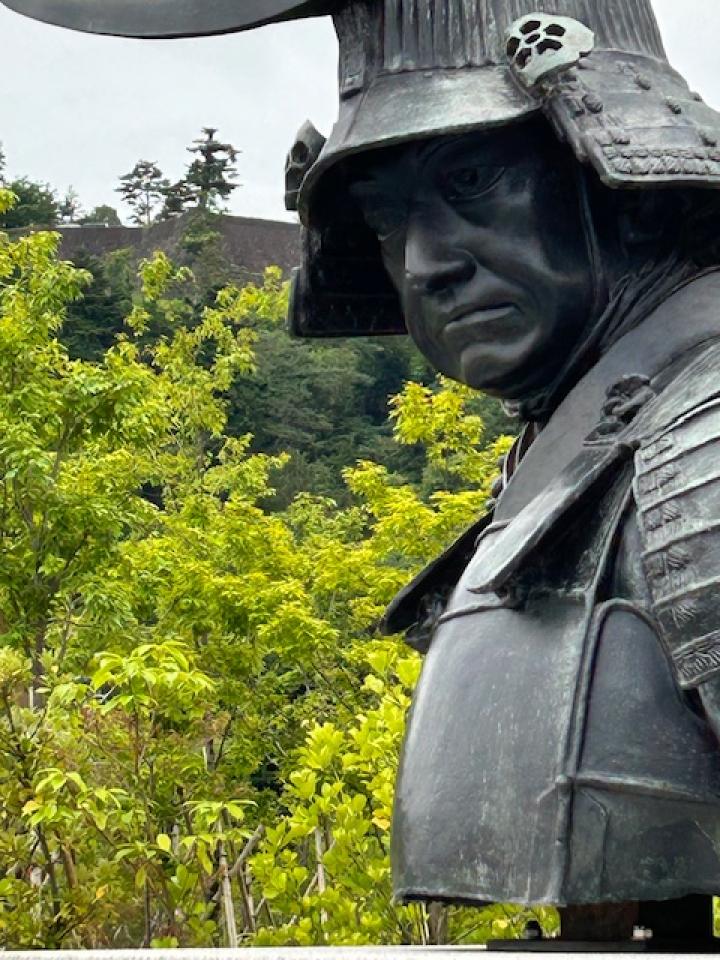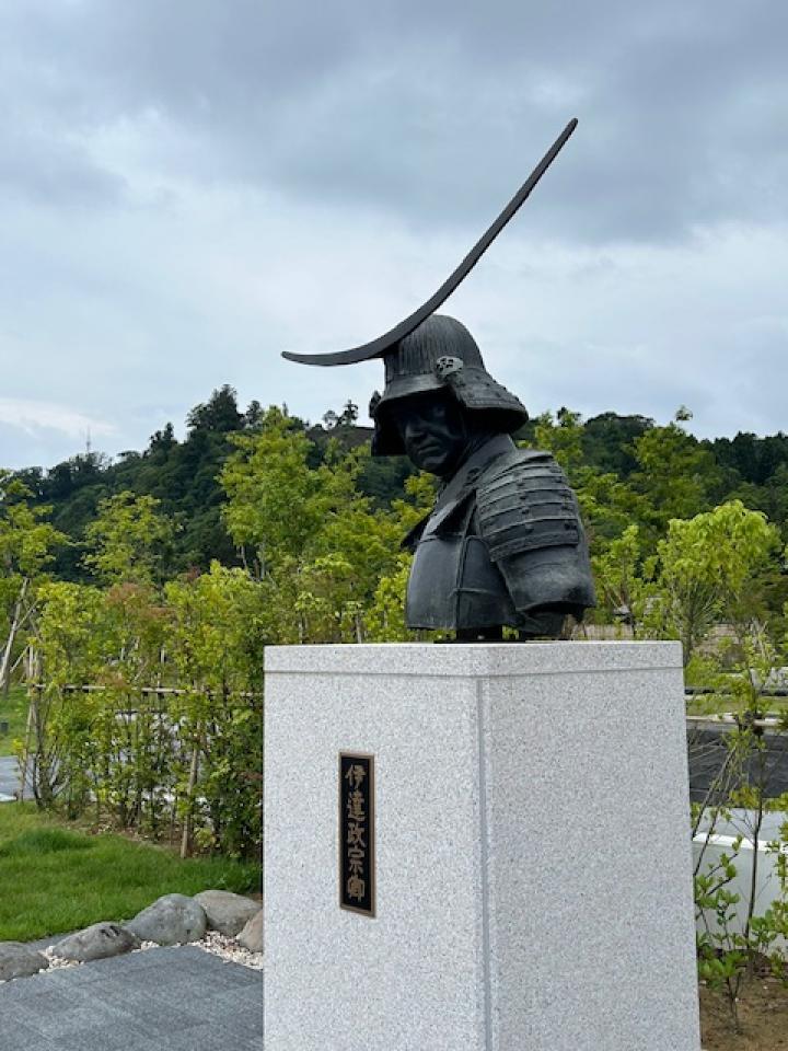 仙台市博物館にあった政宗公銅像は、2023年の都市緑化フェアに合わせて整備された青葉山公園に移設されました。青葉城址にある政宗公騎馬像も、背後の山の上に見えます。