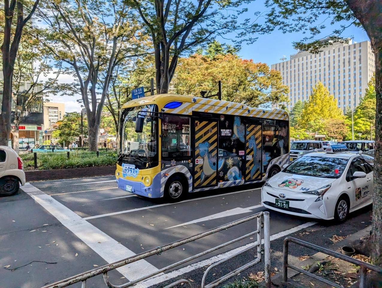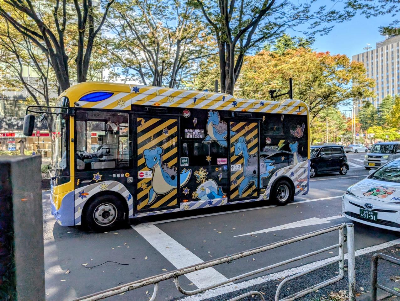 ラプラスがデザインされた可愛い電気で走るバスです。120円で利用出来て仙台駅、定禅寺通、晩翠通、青葉通を循環してます。