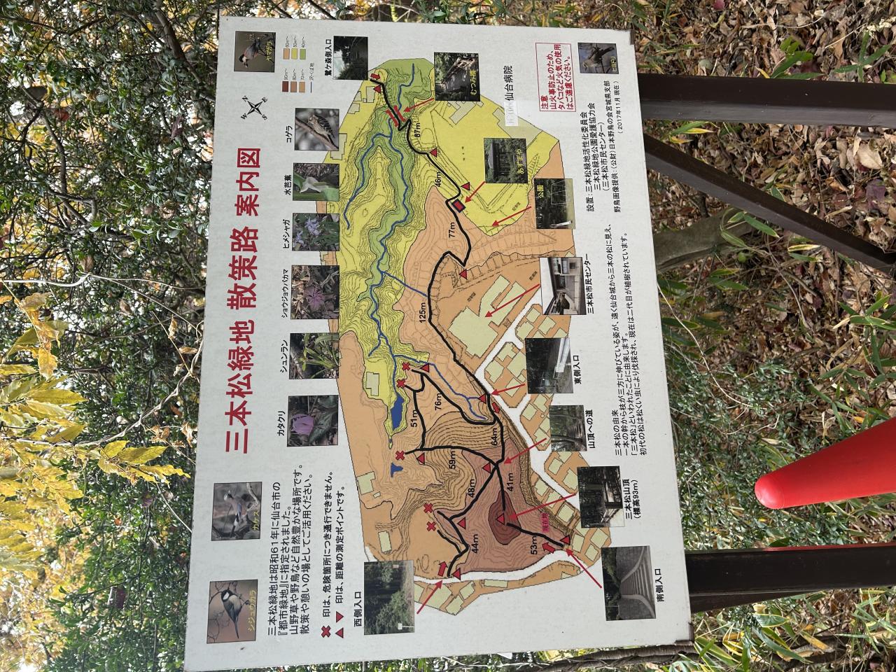 伊達政宗が仙台城からこの丘の上の松を見た時、枝分かれした一本の松が三本に見えたことから、三本松と呼ばれるようになったそうです。見晴らしがよく、大正天皇が皇太子時代の行啓で立ち寄り、市内をを眺められ、松のそばに石碑があります。三本松は昭和50年に枯れてしまい、その後新しい松が植えらました。付近の森は遊歩道があり、緑地になってます。