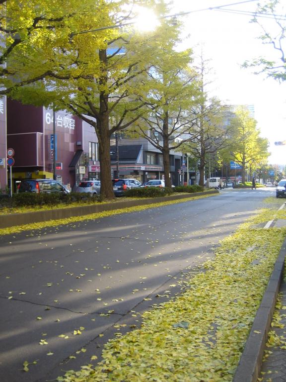 細横丁や定禅寺通りの歩道は、土に帰れない落葉で