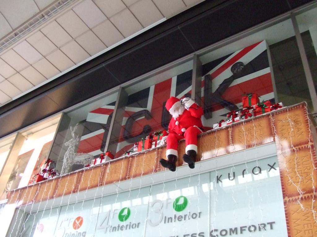 「kurax」にサンタが現れました。このビルはファッション、インテリア、飲食店等のショップが入ったビルで、名称の由来は無限の可能性を表す「X」に、生活の楽しみがいっぱいつまった「kura」を組み合わせて「kurax」だそうです。
