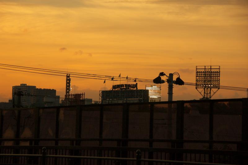 夕暮れになりフルスタの照明が灯され、試合が始まる様子です。