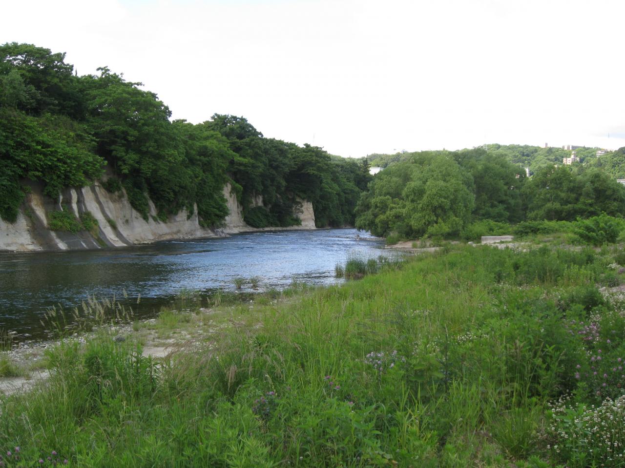 澱橋から上流方向の風景です。木々の緑が濃くなってきました。私の好きな広瀬川の景色のひとつです。