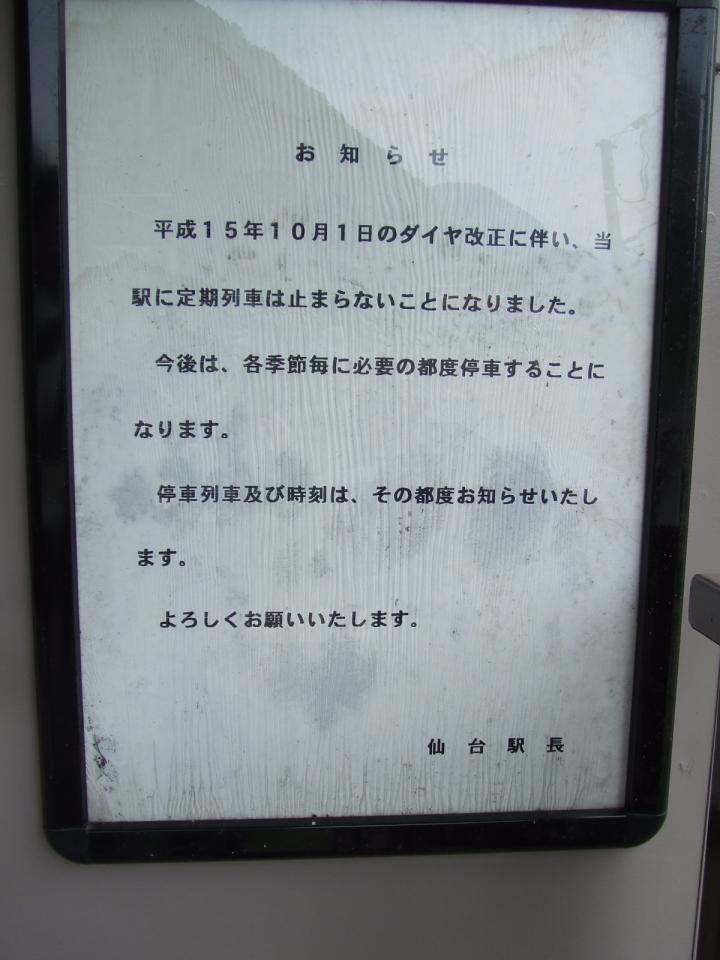 熊ヶ根駅と作並駅の間にあるJR仙山線の臨時駅で、さすがに寂しさが漂っています。