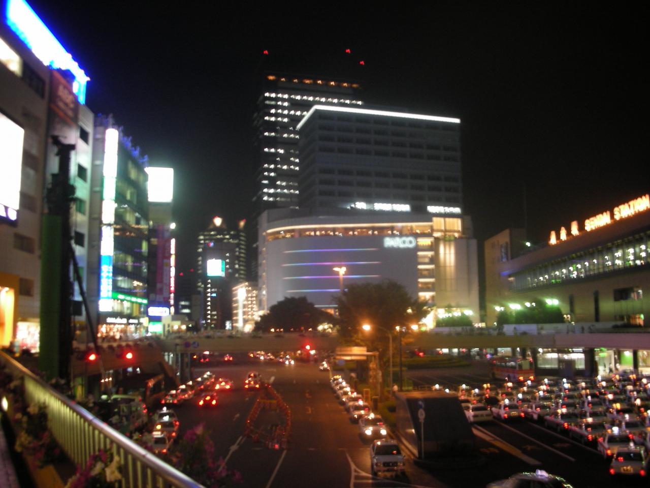 夜の仙台駅前です。いろいろな光で溢れています。