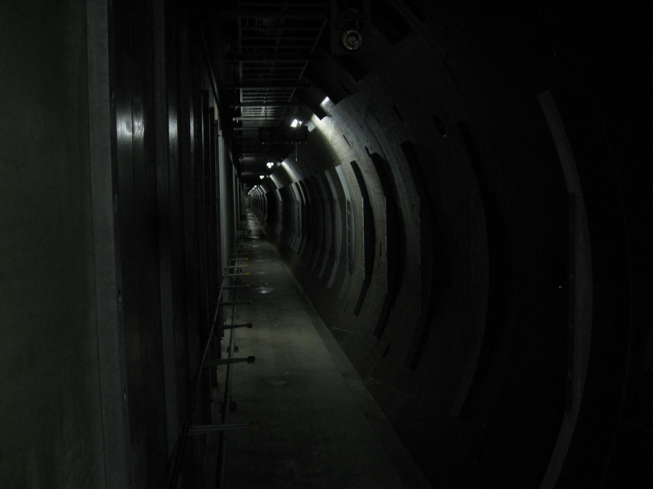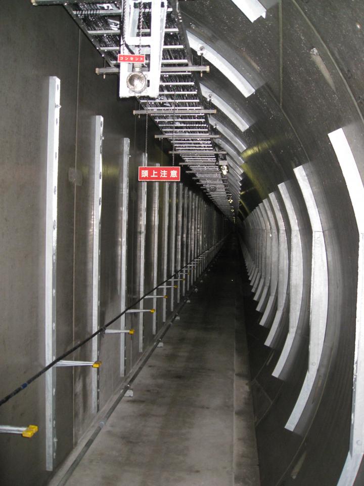 仙台市内にも共同溝が旧4号線、48号線にあります。写真は八幡地区の地下で、円形のトンネルの半分側を歩けるようになっています。地下4階ぐらいのこの通路が、延々と長町まで続いているというのですから驚きです。