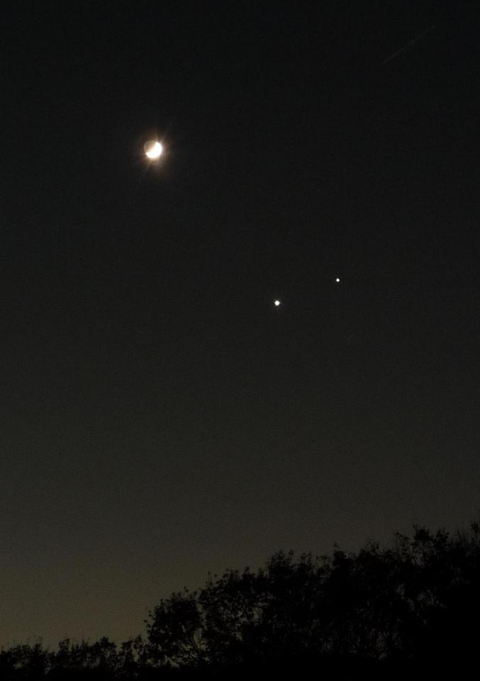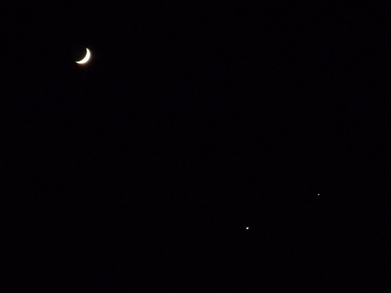 仙台の空に現れた、眼帯をした右目に三日月の兜。正体は大接近した金星・木星・月でした。与兵衛沼公園広場で撮りました。緑に囲まれ、外灯もないため、天体観測に適してます。