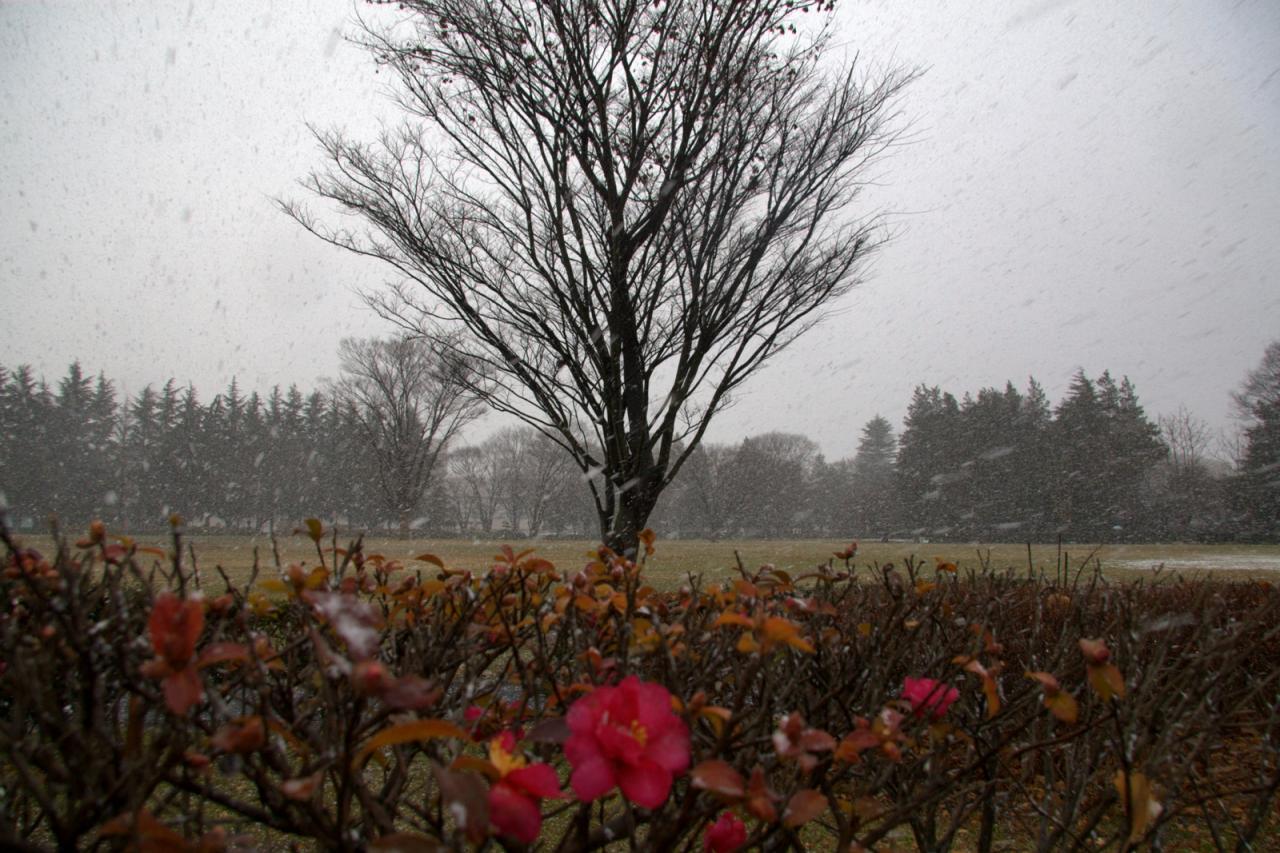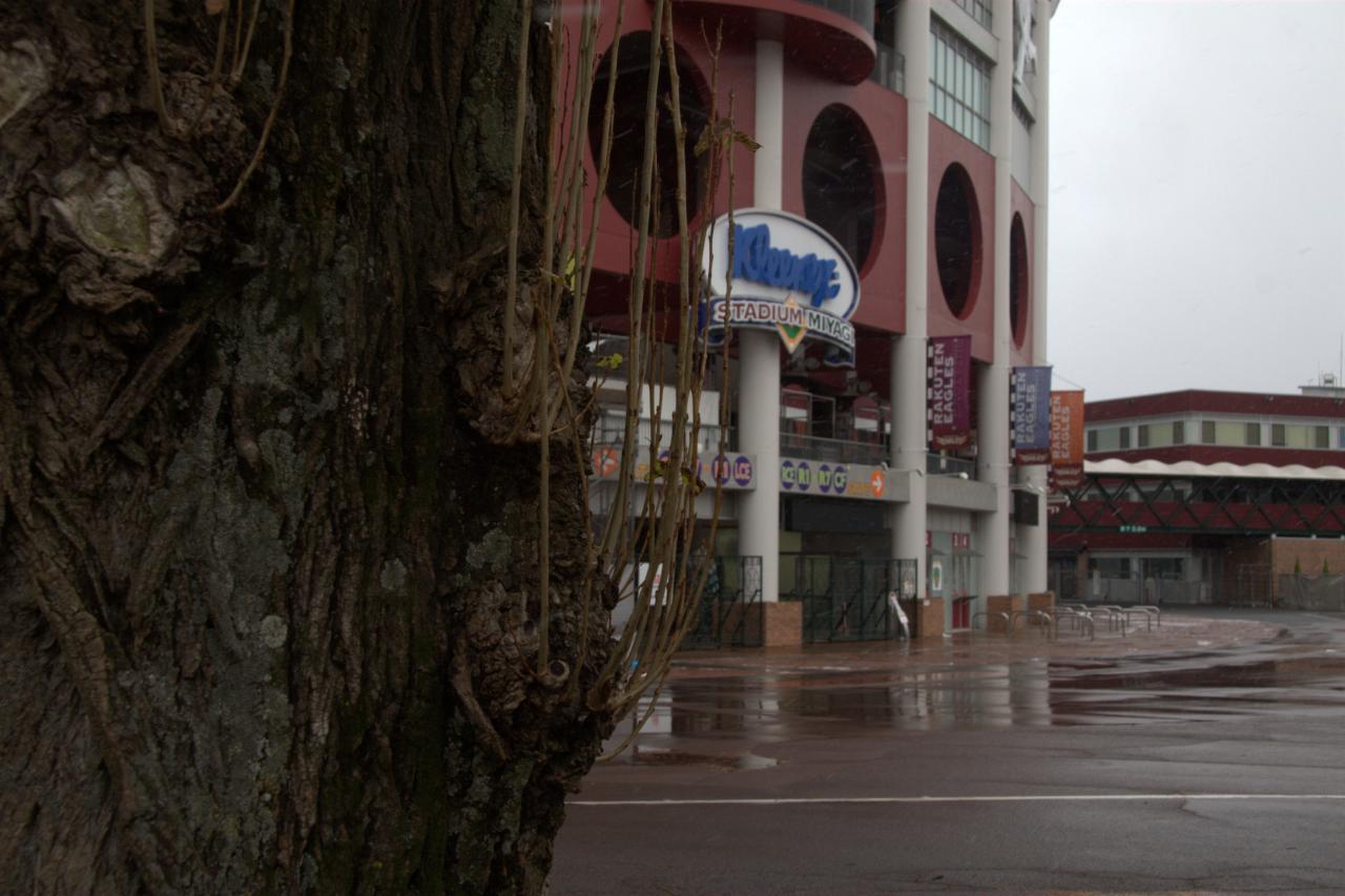 Kスタ、陸上競技場サブトラックなど吹雪のなか、さみしい風景でした
