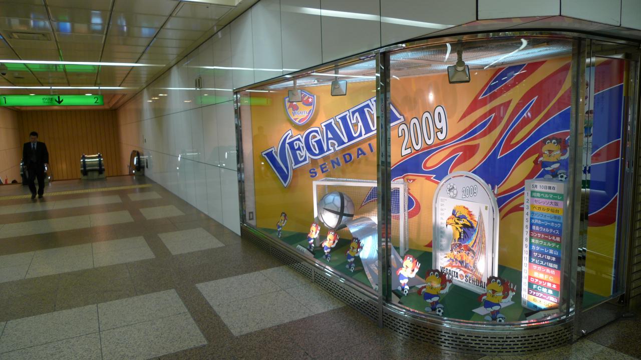 地下鉄仙台駅の改札近くにベガルタ仙台のディスプレイがあります。