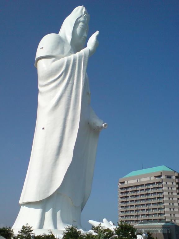 中山地区に立つ、全長100メートルの白衣観音です。仙台市制100周年を記念した高さと言うことで、中にはエレベーターと螺旋状の通路があり、御心殿や多くの観音様などを見ることができます。隣の客室総数203を誇った旧ニューワールドホテルよりもはるかに大きいのが分かります。