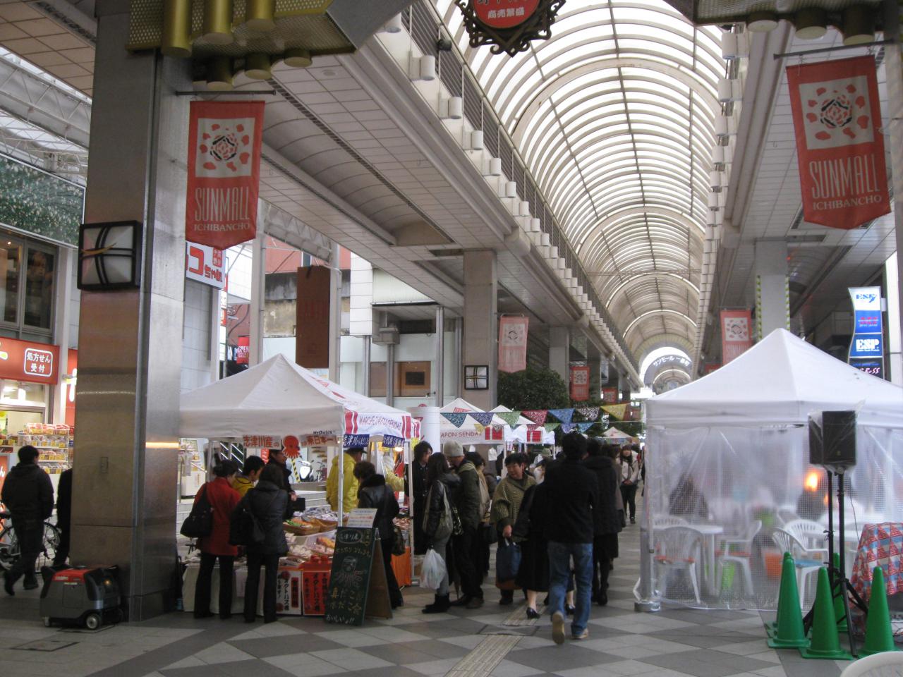 仙台でもサンモール一番町のアーケードに土日にはたくさんの露店が並び、多くの人で賑わっています。