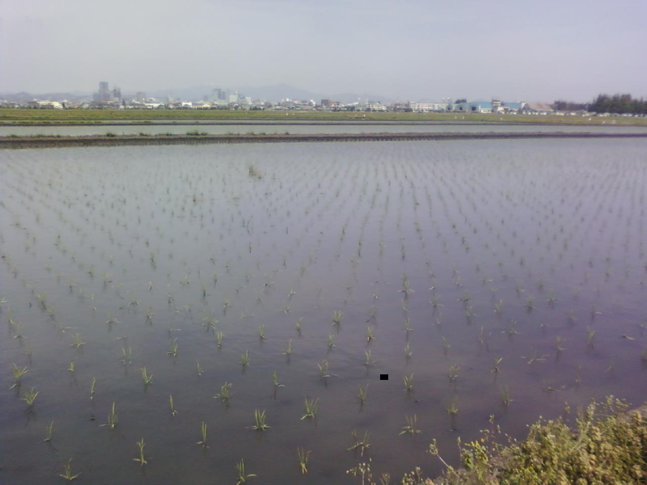あちこちで田植えが始まりました。霞目周辺より市中心部を遠望