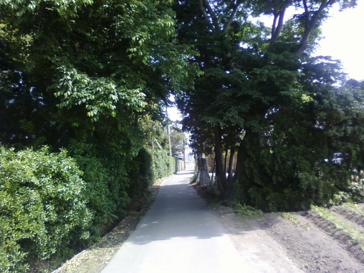 いわゆる居久根です。NHKテレビでも紹介されました。場所は長喜城というところ。遠景と居久根の中を通じている小路の写真です。外はかんかん照りでも、中は涼しげです。何回かに分けて送ります。